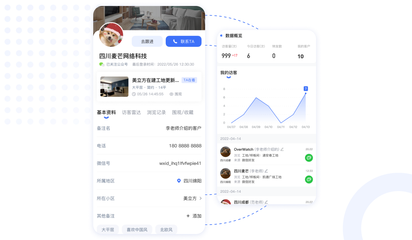 精準引流,客戶軌跡追蹤推送、深度洞察客戶需求。 快速鎖客,直接對話消息及時提醒,增加量房量為銷售賦能。
